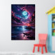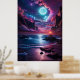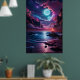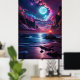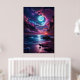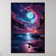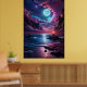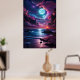 Mergulhe na beleza mesmerante de um poster sonhador que apresenta uma lua espantosa pendurada graciosamente num céu pintado em matizes azuis e roxas de neon encantadores, lançando um brilho mágico sobre um oceano sereno abaixo. A cena tranquila captura a essência da paz e da tranquilidade, convidando-o a escapar para um mundo de calma e serenidade.