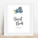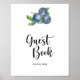 Cartão de convite para chá de fraldas em forma de grão com ilustração aquosa de mirtilos. O texto diz "um bebê doce de fruta está a caminho." Itens correspondentes disponíveis.
