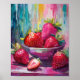 Uma pintura animada de comida de arte moderna em estilo impressionista, apresentando uma vida estática de morangos fundidos com pinceladas brilhantes e texturizadas. As cores vibrantes — cor-de-rosa, vermelha, lacrimejante e amarela — se combinam para criar uma composição ousada e energética. Os derrames texturizados e o uso lúgubre da cor dão vida aos morangos, capturando sua beleza natural de forma fresca e contemporânea.