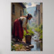 A woman in historical attire is fetching water from a serene stream running through a quaint village. Stone houses line the narrow pathway, and lush greenery adds to the idyllic setting.