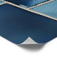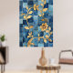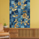 Design: Tiles in varying shades of blue form the background, decorated with golden floral and plant motifs.