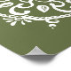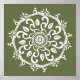 Esta mandala branca senta-se sobre um musgo escuro ou fundo verde-oliva. As cores são harmoniosas e equilibradas. Parte da coleção Payon Mandala.