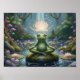Serene, meditating green frog atop a mossy rock in a lotus pond, bathed in mystical light-zen, whimsical forest scene for calming fantasy imagery.