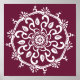 Esta mandala branca senta-se sobre um fundo vermelho-violeta escuro. A cor é profunda e sofisticada. Parte da coleção Payon Mandala.