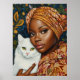 Um retrato cativante de uma jovem africana em um embrulho de cabeça de padrão vibrante, segurando suavemente um gato branco, colocado contra um fundo botânico exuberante.