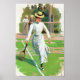 Mulher jogando tênis, por volta de 1900. Ela está vestindo uma elegante saia comprida e blusa. Ela tem um chapéu de palha na cabeça. Há um casal no fundo. Eles estão falando. ____________ A imagem antiga é a cortesia da Biblioteca Nacional da Noruega. Andreas Bloch (1860-1917) foi o artista original. Foi editado e transformado em uma pintura digital por Alma Wad.