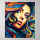 Esta é uma poster divertida no estilo pop de arte do rosto de uma mulher em cores vibrantes para decorar seu quarto, sala de estar, escritório com.