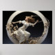 Uma pintura surrealista de uma mulher com um vestido branco escorrendo ninho dentro de um ornamentado de anel branco esculpido. Feito com algoritmos generativos e Photoshop.