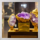 Poster de arte digital fotorealista incrível com uma imagem gerada por IA de uma bela trio de cristais ametistas em pedestais dourados como se fosse exibida em um museu