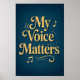 Esta poster é uma bela e inspiradora peça de arte projetada para capacitar. A poderosa frase "Minha Voz Importa" é exibida em uma elegante e brilhante inscrição em ouro, dando a ela uma sensação radiante e luxuosa. Símbolos dourados deliciosos estão espalhados ao fundo, adicionando um toque de ritmo e criatividade. Tudo isso é colocado sobre um fundo azul escuro sereno e profundo, uma cor muitas vezes associada a profundidade, sabedoria e estabilidade. Perfeito para um estúdio, quarto ou escritório doméstico, este poster serve como um lembrete na moda diário para falar sua verdade, expressar suas ideias e deixar sua voz única ser ouvida. É mais do que apenas decoração; é uma declaração de autoestima e uma celebração do seu poder. Faça seu pedido hoje mesmo