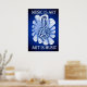 Esta design musical única combina meu amor pela arte e música. Ele apresenta uma grande clave de trechos musicais intricadamente detalhados e estilizados com as palavras "Música é Arte" e "Arte é Música" em um brilhante fundo de estilo de vinheta azul que desaparece para preto nas bordas externas. A própria clave de mesa foi desenhada à mão em caneta e tinta em um design que inclui muitos elementos de padrão repetido, como cestos, linhas, curvas, vieiras, pontos, cordas e espirais. Ao redor da clave de triplo está uma explosão de linhas rebuscadas que representam o funcionarios musical ou o salto e as ondas sonoras de música vindas do centro. O design é cuidadosamente sombreado para um efeito 3D dimensional.