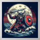 Um guerreiro viking feroz, coberto em chainmail e capacete corado, está na costa, pronto para embarcar numa expedição de invasão. Ele guarda uma espada e um escudo, seu rosto iluminado pelo brilho da lua de cheio. A imagem evoca um senso de aventura, perigo e o espírito indomável dos Vikings.