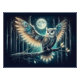 A luminous night scene captures a majestic owl perched beneath a glowing full moon, wings outstretched in a moment of quiet power. Intricate feather patterns blend folk-inspired detail with celestial motifs, creating a magical balance between nature and fantasy. Deep navy skies, soft teal highlights, and warm golden accents weave together to form an enchanting, dreamlike atmosphere. Subtle forest silhouettes fade into the background, adding depth and mystery, while tiny star-like lights shimmer throughout the scene. This artwork evokes a sense of wisdom, stillness, and wonder, perfect for those drawn to mystical woodland energy and celestial beauty. AI generated artwork.