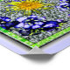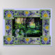 Uma bela floresta verde num verão ensolarado cedo ou primavera. Uma estrada florestal com poças de brilho leva à luz. Pastel, fotografia, arte digital. A borda floral (dandelion e bluebell) e cinza denim tem um pouco do "estilo Artes e Artesanatos".