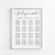 Gráfico de assentos de na moda para download de poster para até 16 mesas com "Encontre seu assento" em um roteiro de chic com baloiços e seus nomes e data de casamento juntos por um coração com uma simples tipografia moderna. A opção de download digital permite que você edite com alterações de última hora e impressão localmente.
