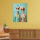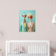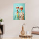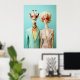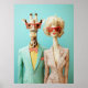 Uma imagem surreal do estilo pop-art com uma girafa e uma mulher glamourosa vestida de roupas elegantes e inspiradas na safra. Ambos vestem óculos de sol vermelhos sobredimensionados, exuando charme de alta moda contra um fundo de turquesa pastel.