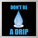 Traga algum humor para as suas paredes com este poster "Não seja um gotejante", que chama a atenção, com uma ilustração vibrante de gotas de água azul. Perfeito para casa, escritório, salas de aula ou dormitórios, este design lúdico adiciona uma vibração motivacional, mas iluminada, a qualquer espaço. Impresso em alta qualidade, faz uma conversa única começar e uma peça divertida de arte em parede.