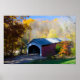 A Impressão de Poster da ponte russa coberta pela cruz apresenta uma fotografia de queda cênica digitalmente pintada e amolecida de uma ponte histórica de madeira vermelha coberta em Parke County, Indiana com folhas coloridas e céu azul no fundo. A Ponte Estreita foi construída em 1882 por J.A. Britton sobre Sugar Creek na Estrada Narrows perto do Parque Estadual de Corrida da Turquia. Esta encantadora poster faz uma ideia de presente única para um amante de ponte coberto ou residente de Indiana.