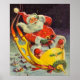 Vintage ilustra as férias de Natal com um retrato alegre do Pai Natal a voar numa nave de ficção científica sobre uma cidade sonolenta na véspera de Natal.