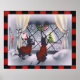 Os natais vintages escoceses Terrier Dogs observam a janela para o Papai Noel chegar. Lá fora está uma cena festiva de árvores de Natal, neve e uma coroa de Natal. Uma bandeira americana senta-se ao lado destes pequenos e bonitos animais de companhia. Mostrado sobre um fundo vermelho e preto. Arte de cão Vintage para a sua casa.