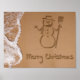 Ilustração de Natal ensolarada com um boneco de neve e Feliz Natal escrito na areia na praia ao lado do oceano.