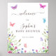 Este elegante e na moda chá de fraldas sinal de boas-vindas apresenta um bonito jardim de flores silvestres adornado com borboletas azuis, cor-de-rosa, roxas e acompanhado de uma tipografia elegante. Perfeito para chás de fraldas de sexo neutro, rapazes ou raparigas. Personalize-os com seus detalhes e utilize a ferramenta de edição para fazer outros ajustes, como tamanho da fonte, posicionamento ou cor.