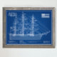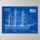 Este impressionante cartaz em estilo de planta azul retrata o histórico clíper americano Flying Cloud, um navio celebrado por sua notável velocidade e design elegante. Construído em 1851 no East Boston pelo famoso construtor naval Donald McKay, o navio representou o auge da engenharia de clíperes durante a idade de ouro do comércio marítimo. A linha branca contra o fundo azul profundo se assemelha a plantas de engenharia tradicionais, dando à imagem uma qualidade técnica e artística.