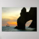 Um veleiro de estilo tradicional, de 3 mastros na silhueta é visto novamente como um pôr do sol brilhante, tudo com os famosos arcos rochosos da linha de costa de Los Cabos.