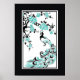 O pavão negro, aqua e a cereja florescem poster impressão, personalizado, com uma silhueta negra e turquesa de pássaro e uma galeria de cereja - sakura - com lindas flores em fundo branco e uma borda negra à sua volta. Um design elegante com um talento asiático oriental.