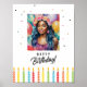 Esta poster colorida apresenta uma linda e sorridente mulher negra vestindo uma coroa floral, cercada por balões. Confetti, velas, e as palavras "Parabéns" juntam tudo numa saudação festiva de aniversário! Celebre a magia melanata aniversariante em sua vida com este poster de festa multicolorido.