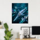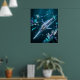 A sleek neon swordfish races through futuristic ocean depths, built from chrome scales, glowing propulsion lines, illuminated fins, and a razor-sharp energy blade. Electric blue, cyan, violet, and silver light streaks across its streamlined body, capturing pure speed and elegance. Tunnels of light, glowing reefs, bubbles, motion trails, suspended particles, and deep dark water enhance the cinematic rush. This premium marine design is perfect for offices, gaming rooms, coastal interiors, and collectors who love dynamic ocean creatures.