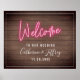 Sinal de boas-vindas de casamento com um sinal de boas-vindas neon com fundo inspirado em madeira e texto branco.
