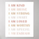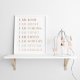 Apresentando o Poster de Afirmação de Crianças, uma bela peça projetada para capacitar e elevar jovens corações. Apresentando o mesmo terracota, rosa poeirento e tons beges, juntamente com a encantadora inscrição vestida, esta poster cria uma adição deliciosa ao quarto de qualquer criança. Esta poster é um lembrete visual das afirmações positivas que alimentam a autoestima e a confiança de uma criança. Com poderosas declarações como "Eu sou gentil", "Eu sou corajoso", "Eu sou forte", "Eu sou inteligente", "Eu sou amado", "Eu sou digno", "Eu sou especial", e "Eu sou o suficiente", isso encoraja as crianças a abraçar suas qualidades únicas e reconhecer seu valor. Essa poster serve como dose diária de positividade, lembrando às crianças sua bondade inata e seu potencial ilimitado. Faz um presente significativo para aniversários, feriados ou qualquer ocasião em que você queira inspirar e apoiar uma criança em sua vida. Aproveite o poder das afirmações e crie um ambiente de nutrição para os seus pequenos. Explore nossa coleção de Posters de Afirmação de Crianças para mais peças empoderadoras que celebram suas qualidades únicas e as ajudam a prosperar.