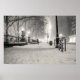 Esta fotografia de paisagem urbana de arte mostra uma bela vista da rua 42 no centro de Manhattan coberta de neve. Uma pessoa caminha à distância sob as distintas e únicas árvores do Parque Bryant à medida que a neve gira e cobrir tudo de uma bicicleta próxima à rua vazia da cidade. O acabamento preto e branco desta imagem noturna da cidade de inverno dá-lhe uma sensação clássica e eterno. Este Nova Iorque de inverno é totalmente personalizável. Personalize-o com texto, nomes, uma ocasião ou deixe-o como está!