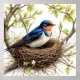 A ilustração detalhada de uma andorinha de celeiro pregada no seu ninho numa ramificação florida transmite um ambiente sereno e natural.