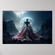 Uma figura misteriosa em um vestido elaborado se posiciona diante de uma lua de cheio brilhante, colocada contra uma paisagem dramática rochosa. A cena é potencializada pelo contraste entre os detalhes intrincados do vestido e o terreno robusto.