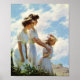 Um poster de arte fino com a pintura impressionista do artista americano Charles Courtney Curran (1861-1942), On the Cliff (1910). Curran é conhecido por seu uso de luz em seu trabalho de arte. Duas mulheres e uma jovem de vestidos brancos num penhasco.