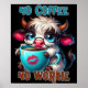 A funny and sarcastic design features a cute highland cow sitting with a steaming coffee mug that has a lipstick kiss mark on the front. The cow, with big blue eyes, glasses, and a soft expression, has black and white fur. Bright, colorful text reads: "No coffee, no workie." This playful design is available on various products, making perfect gifts for coffee lovers.