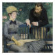 No Conservatório. Edouard Manet. Retrato de grupo em tons verdes. Uma mulher está sentada em um banco no parque com um guarda-chuva em suas mãos e um chapéu fofo. Há um homem com barba atrás do banco. Reprodução de famosas imagens de arte no dominio público.