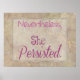 Uma frase que rapidamente se tornou um grito de guerra para o movimento dos direitos das mulheres, assim como para os atuais movimentos políticos de direitos civis em geral. A força para persistir continuará a ganhar o dia, a tempo, em todos os obstáculos. Uma maneira perfeita de mostrar seu apoio... No Entanto, Ela Persiste.