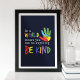 Uma poderosa e modesta impressão de arte motivacional com a citação Num Mundo onde você pode ser qualquer coisa, Seja gentil em cores do arco-íris com uma ilustração de quebra-cabeça de mira multicolorido.