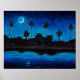 Uma lua crescente pendura sobre uma paisagem tropical estrelada. De uma pintura original criada no local pelo artista William Weith.
