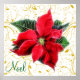 Esta flor fracionalizada de poinsettia contra um fundo de vinha ouro faz um elegante design de Natal. "Noel" é impresso no canto inferior esquerdo, em uma fonte verde elegante.