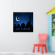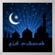 Eid Greeting ilustra com silhuetas da lua, estrelas e uma mesquita em um céu azul noturno.