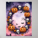 Este poster captivador apresenta um design com o tema do Dia das Bruxas com um arranjo central em forma de coroa de galhos roxos. Dentro desta armação, você encontrará lanternas, crânios e velas fantasmagóricas contra um céu noturno azul e roxo profundo com lua crescente e morcegos voadores. Perfeito por adicionar um toque assustador, mas lúgubre, ao seu decor de Halloween.