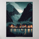 As Ilhas Lofoten estão localizadas no Círculo Ártico Norueguês, onde fiordes, fiordes e montanhas se intersetam para formar uma paisagem natural espantosa. Esta poster apresenta uma bela imagem das Ilhas Lofoten à noite num estilo de arte digital. As montanhas estão cobertas de neve branca, e há uma fila de casas locais com formas especiais e bonitas na costa. As reflexões das casas e luzes na água são muito bonitas na noite escura. Há flocos de neve leves flutuando no céu. Há algumas silhuetas de turistas no primeiro plano se divertindo. Essa beleza.