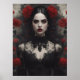 Uma noiva gótica em seu vestido de noiva preto cercado por rosas vermelhas está pronta para seu casamento no dia das bruxas. Arte gerada por IA