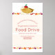 Poster para uma unidade de comida fornecida por uma organização, empresa ou outro grupo. Esta poster de unidade de comida solicita comidas não perecíveis e não expiradas. Inclui a data e a hora do evento e a localização. Ele apresenta uma torta de maçã sorridente e folhas coloridas de queda.