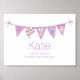 Bandeiras bonito com nomes de arte poster perfeito para o quarto ou sala de jogos de uma menina em tons roxos, cor-de-rosa, amarelo cremoso e branco. Personalize com o próprio nome inicial do seu filho na bandeira de posicionamento médio, nome e nome que significa um toque verdadeiramente personalizado no quarto ou quarto do seu filho, este exemplo é para o nome Katie Pure e inocente. Ambicioso com forte vontade. Poster de menina bonita ideal para uma nova menina, batizando ou chá de fraldas. Desenho e arte gráfica únicos e design por Sarah Trett para www.mylittleeden.com