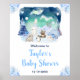 Este sinal de boas-vindas de chá de fraldas de aquarela giro e giro apresenta uma cena nas terras maravilhosas de inverno com adoráveis animais árticos, como um urso polar, pinguim, gato, coruja, foca e um alce. Ao fundo estão as luzes do norte, montanhas e árvores com capa de neve. O texto combina o script manuscrito e as fontes sans serif para uma aparência na moda e moderna. Flocos de neve a cair e belos arranjos florais azuis dão uma sensação de inverno. Isto é perfeito para chás de fraldas de inverno e Natal.